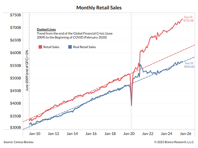 Consumer spending has been up over the last six years, big time! That red line in the adjacent graph exploded higher. Adjust spending for inflation, and it looks about the same as it has for the last 15 years. Inflation is powerful and stealthy.