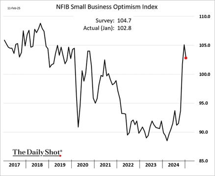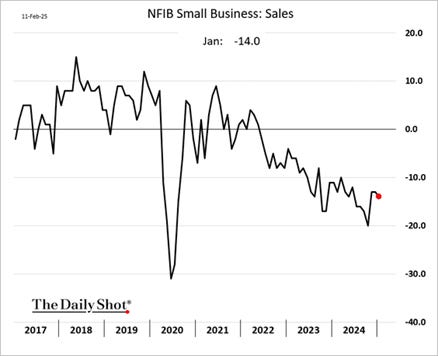 The S&P 500 reached all-time highs this week. Investors are incredibly optimistic about the economy. The small business optimism index illustrates just how positive people in these businesses feel. Despite the optimism, the next chart shows us that sales are still falling. This divergence should not last. If sales do not improve, optimism should decline.
