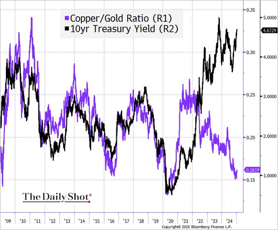 This graph illustrates the correlation between the 10-year interest rate and the copper/gold ratio. While these lines have mirrored each other, there is no inherent reason for this to continue. The ratio should reflect inflation (copper) and investor demand for safety (gold), both of which significantly impact bond attractiveness. A potential convergence could lead to falling bond yields and rising bond prices.