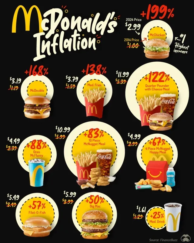 The official CPI reports a 32% inflation rate over the past decade, but real-world prices tell a different story. Inflation at McDonald's is worse than expected. In 2014, a Quarter Pounder meal was $5.39. By 2024, it costs $11.99, a 122% increase. A medium fry is nearly $4. These prices don't even account for changes in portion sizes, quality, or nutrition. Housing prices have also surged, with the median home price rising from $281,000 in 2014 to $420,000 in 2024, a nearly 50% increase. Don't get me started on the cost of college tuition and insurance. Inflation hurts!