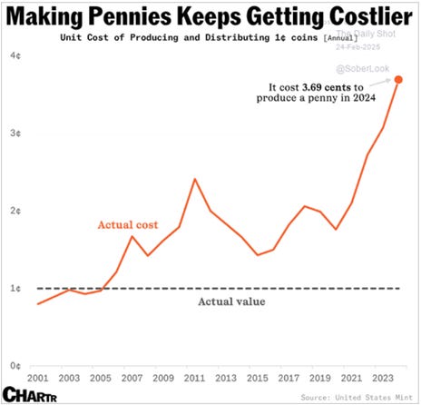 It costs 3.7 cents to make a penny and 13.8 cents to make a nickel. That’s right. We are losing money, minting every penny and every nickel. The U.S. Treasury minted 4.5 billion pennies in 2023. That is a loss of 121 million dollars. We lost another 85 million dollars on the nickel. These are dollars that get borrowed, and we pay around 4% interest. As a coin collector, I appreciate the sentimental value of these coins, but enough is enough. The value of these coins will continue to decrease, thanks to inflation.